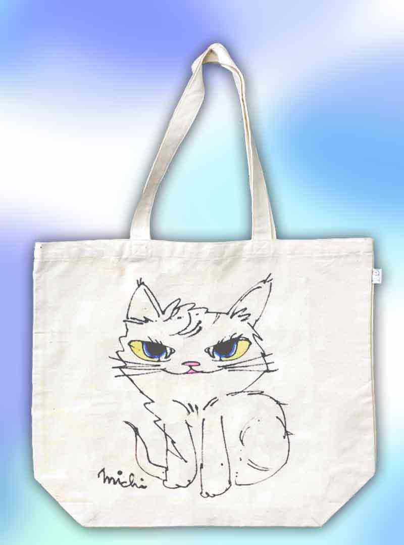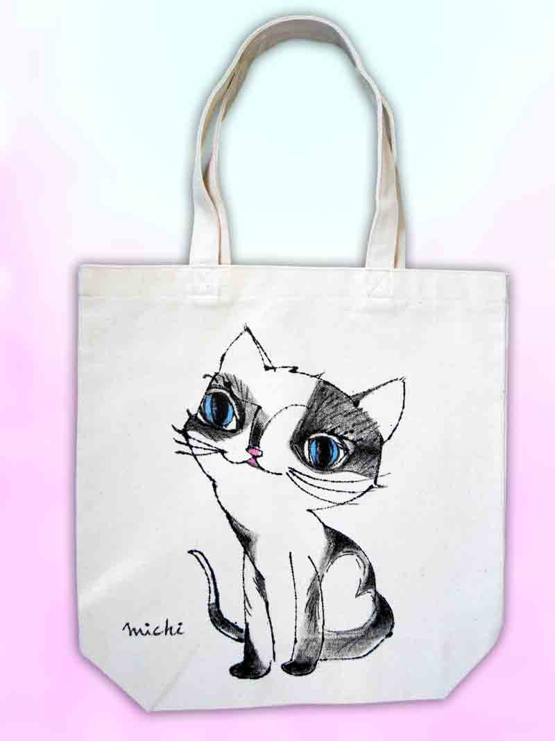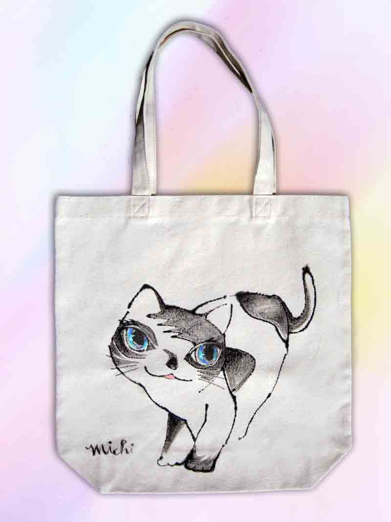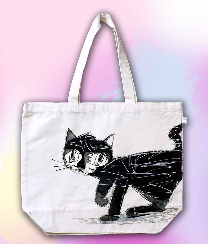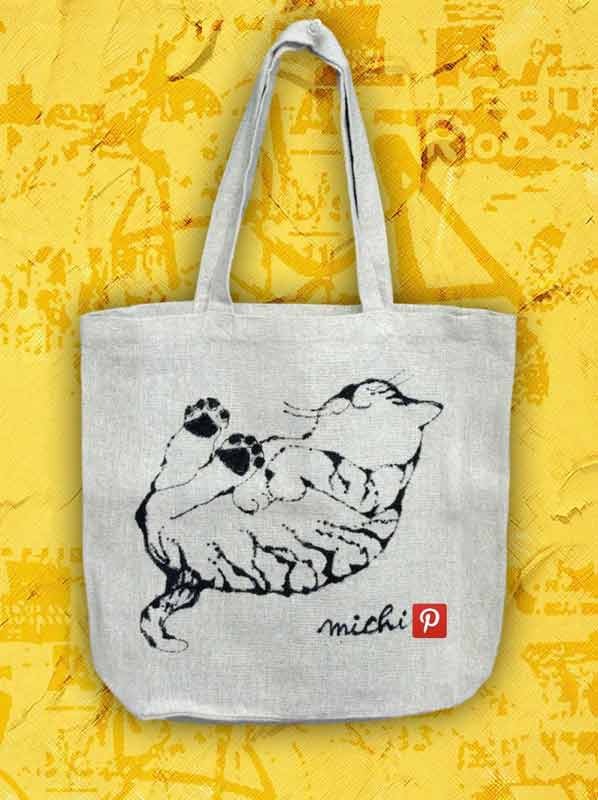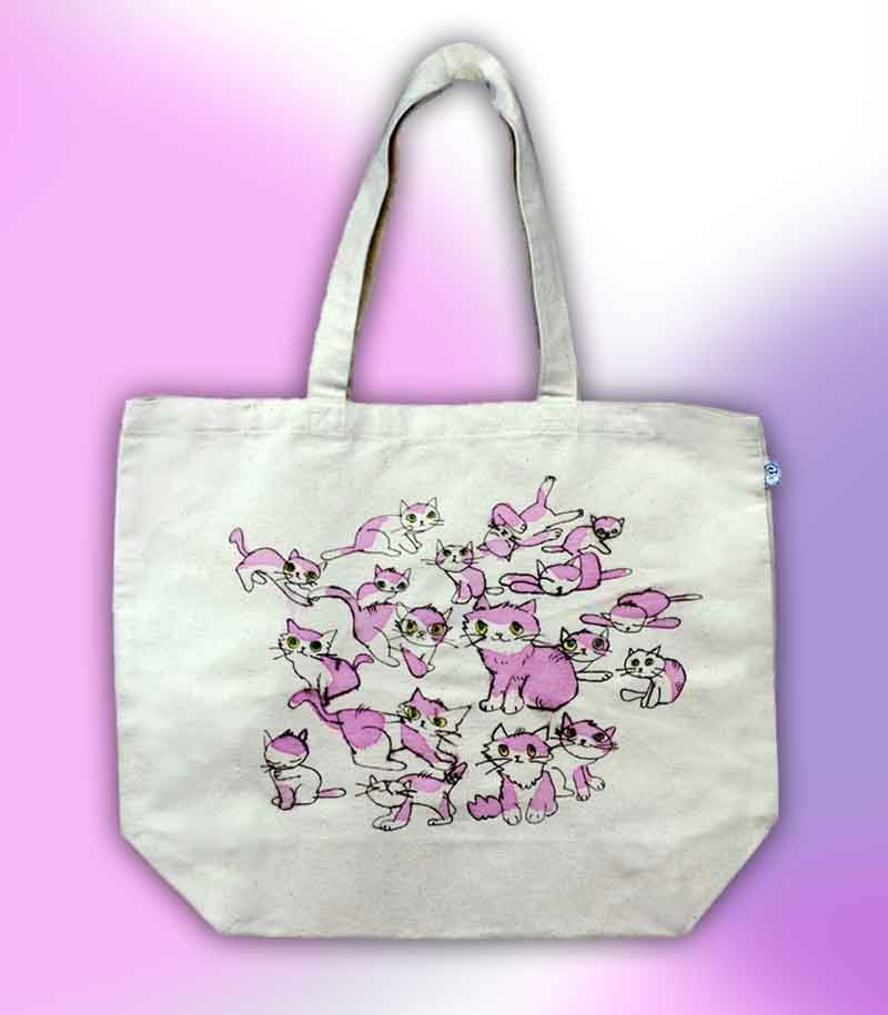 何も描かれていない無地のエコバッグに猫の絵を描いています。いろんなスタイルで個性的に表現しています。ピンタレストのロゴマークはPhotoshopでペーストしています。